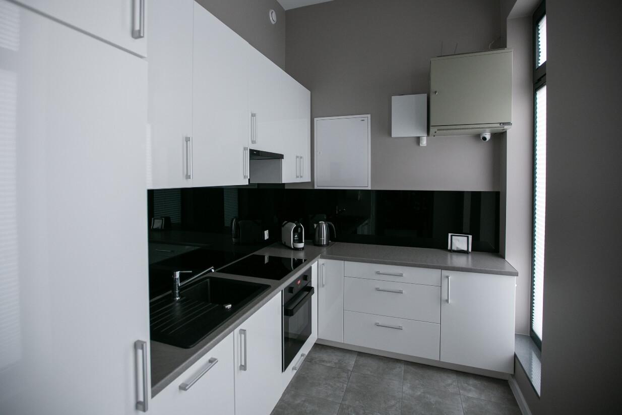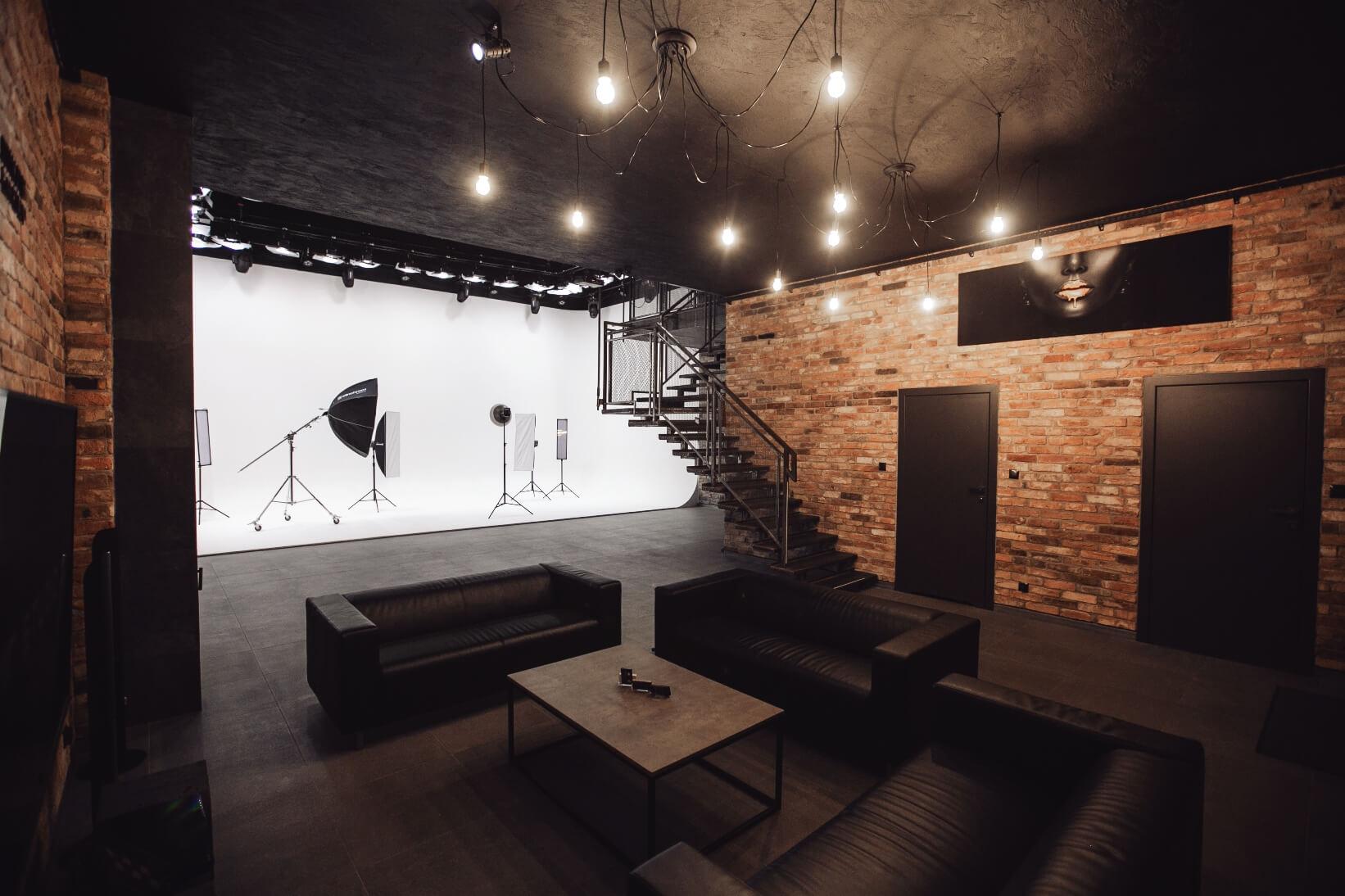 Studio bezpośrednio połączone jest ze strefą użytkową, znajdziemy tam 2 łazienki, w tym jedna z prysznicem i miejscem np. do makijażu, kolejnym miejscem jest w pełni wyposażona kuchnia oraz miejsce do odpoczynku wyposażone w 65” telewizor 4k, dobrej jakości nagłośnienie oraz kanapy. Na piętrze możliwa do wynajęcia montażownia oraz przeszklone pomieszczenie do wykorzystania jako np. reżyserka.